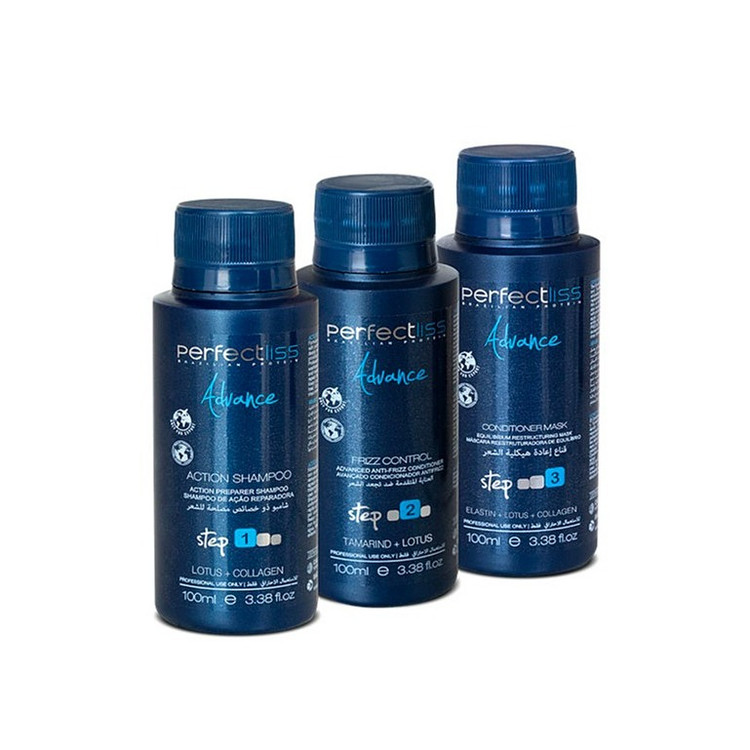 شامپو قبل یا حجم 100 میلی لیتر، کراتین احیاء کننده 100 میلی لیتر پرفکت لیس ادوانس و ماسک تثبیت کننده با حجم 100 میلی لیتر